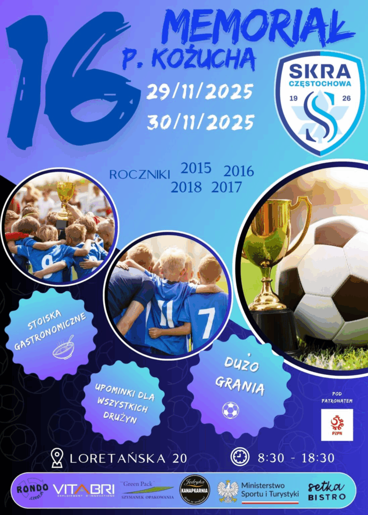W najbliższy weekend w dniach 29-30 listopada 2025 przy ulicy Loretańskiej 20 Akademia Skry Częstochowa zorganizuje 16. edycję Memoriału Przemysława Kożucha. W tym roku w turnieju pod patronatem Polskiego Związku Piłki Nożnej wezmą udział aż 64 kluby z całej Polski. Mecze będą rozgrywać zawodnicy z roczników 2015, 2016, 2017 oraz 2018. Oprócz rywalizacji i sportowych emocji na uczestników i kibiców będzie czekać mnóstwo atrakcji, m.in.:
