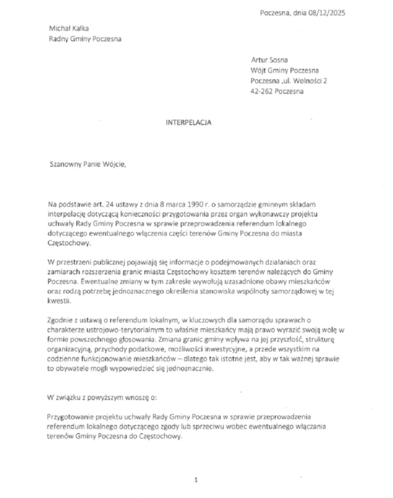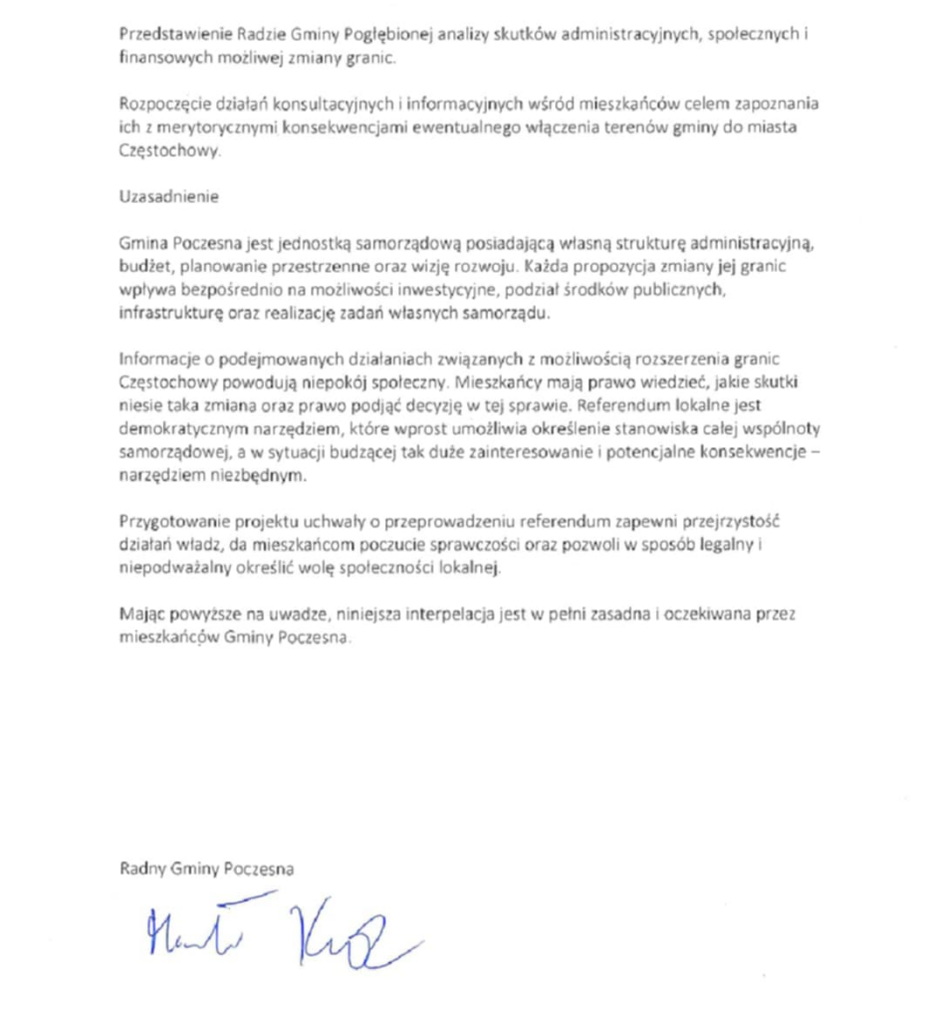 W związku z uchwalonymi już zamiarami – władz Częstochowy – wchłonięcia części gminy Poczesna radny gminy Michał Kałka skierował interpelację w sprawie przeprowadzenia wśród mieszkańców całej gminy referendum w tym temacie.