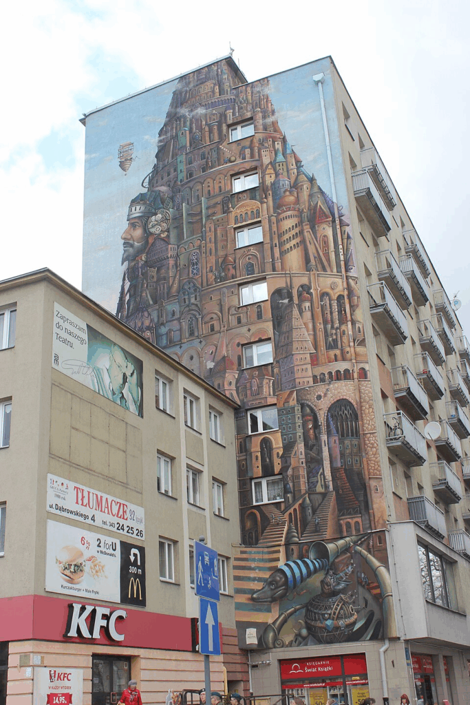 Monumentalny mural stworzony na elewacji budynku przy ul. Dąbrowskiego 1 w sąsiedztwie placu Biegańskiego. Po raz pierwszy ukazany został 10 października 2014 roku. Tytułowa Wieża Babel nawiązuje do przypowieści biblijnej. Ma ona pokazać, że chociaż mówimy jednym językiem, to trudno nam się porozumieć. Mural znajduje się kilometr od klasztoru jasnogórskiego. Skłania to nas do pewnych refleksji, związanych z tym, że: „pomnik ludzkiej pychy zdaje się kłócić z chrześcijańskimi naukami płynącymi z pobliskiej Jasnej Góry” – trafnie określił Wiktor Zalewski z portalu uniwerek.tv.
