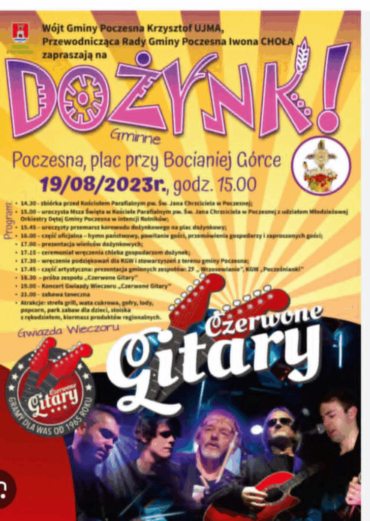 Mowa tutaj o gminnych dożynkach, które w 2023 roku odbyły się na placu przy Bocianiej Górce w Poczesnej i było to niezwykle huczne wydarzenie, na którym pojawili się między innymi znani politycy z rejonów Częstochowy, na czele z ówczesnym wiceministrem kultury i dziedzictwa narodowego, posłem Szymonem Giżyńskim, czy też posłanką Prawa i Sprawiedliwości Lidią Burzyńską. Gwiazdami wieczoru był z kolei kultowy zespół „Czerwone Gitary”.