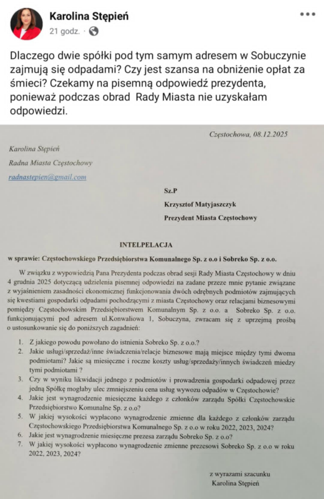W sprawie zasadności działania obu spółek do prezydenta Częstochowy Krzysztofa Matyjaszczyka trafiła interpelacja złożona przez radną Prawa i Sprawiedliwości Karolinę Stępień. Radna pytała też o wpływ działalności dwóch spółek na ceny wywozu odpadów w Częstochowie oraz o szczegóły dotyczące wynagrodzeń członków zarządu obu spółek.