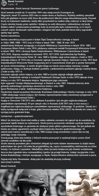 – Józefa Jarmułę zapamiętam przede wszystkim jako showmana i niezwykle dziarskiego „dziadka”. Bodajże w 2008 roku dał popis pokazowej jazdy między biegami któregoś z turniejów. Przywdział skórę, założył charakterystyczny kask, dosiadł przepięknego, błyszczącego rumaka. Po kilku minutach zwyczajnie nie dowierzaliśmy, jak ten gość wygina się na motocyklu, jak trzyma gaz. W swoim „prajmie” musiał być nieprawdopodobnym kozakiem – przekazał nam Damian Klos, były mechanik żużlowy i pasjonat speedwaya.