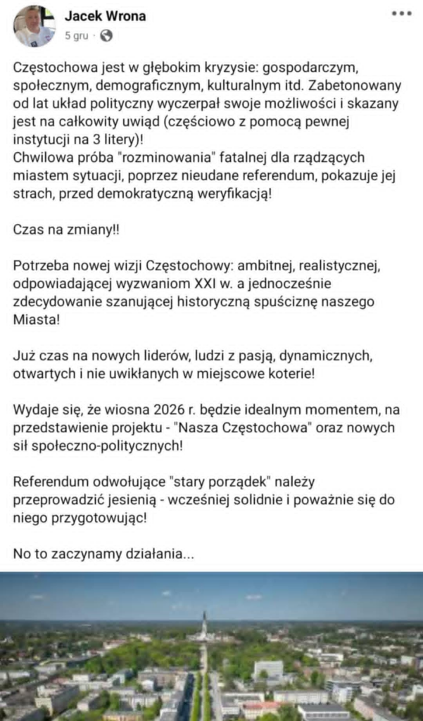 Przed dwoma tygodniami za pośrednictwem platformy Facebook były komisarz Policji, a obecnie prawicowy aktywista polityczny związany z Ruchem Obrony Granic – Jacek Wrona, przedstawił wstępny plan narodzin projektu ,,Nasza Częstochowa”. Miałoby to nastąpić w nadchodzącym 2026 roku i jak wynika z przedstawionych informacji, głównym założeniem powstania inicjatywy ma być odwołanie Krzysztofa Matyjaszczyka z funkcji prezydenta miasta Częstochowy.