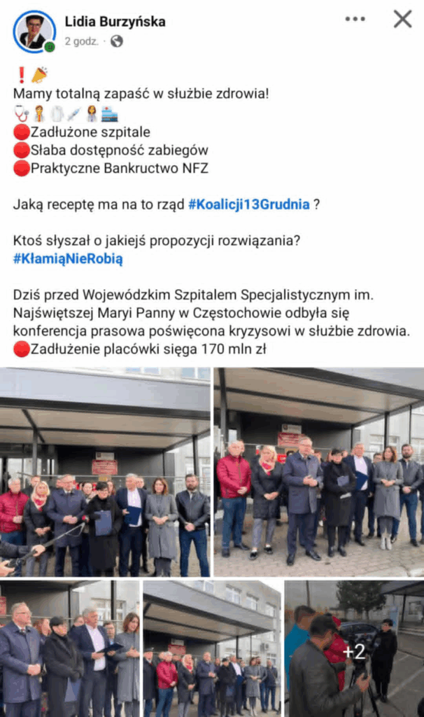 „Na skraju bankructwa może być jakaś firma, może być jakaś działalność… ale żeby prezes naczelnej izby lekarskiej powiedział, że NFZ nie ma funduszy, a pani minister zdrowia mówi o likwidacji 30% szpitali? Te słowa budzą oburzenie i moją pogardę. Nie dajemy na coś takiego przyzwolenia. Dowiadujemy się również, że kobiety mieszkające w mniejszych miejscowościach – między innymi w powiecie częstochowskim – miałyby rodzić na SOR-ach, jeżeli zlikwidowana zostanie porodówka, ponieważ nie przynosi ona zysków, bądź nie jest samowystarczalna. Czy to nie jest kpina z Polek i Polaków? Kolejnym ciekawym wątkiem, który trzeba poruszyć, jest temat kardiologii, na którą przeznaczono 200 milionów złotych z KPO. Ale przeznaczono je na kardiologię prywatnych podmiotów. Żeby była jasność – ja nie jestem przeciwna prywatnej służbie zdrowia, ale najpierw rząd powinien zapewnić zabezpieczenie dla państwowych szpitali, a potem jeśli są fundusze, to można je rozdawać” – mówiła podczas konferencji posłanka Lidia Burzyńska.