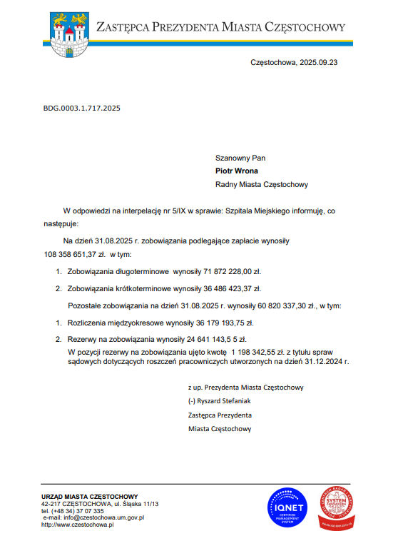 Oprócz szpitala specjalistycznego na Parkitce, nacisk został położony również na sytuację Miejskiego Szpitala Zespolonego w Częstochowie. W temacie tejże placówki w niedawnym czasie interpelował również obecny na konferencji radny Piotr Wrona. Tak prezentuje się odpowiedź na interpelację: