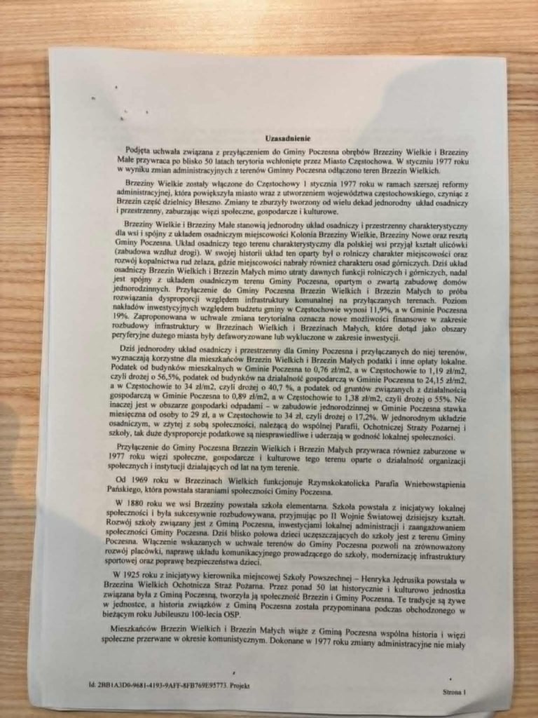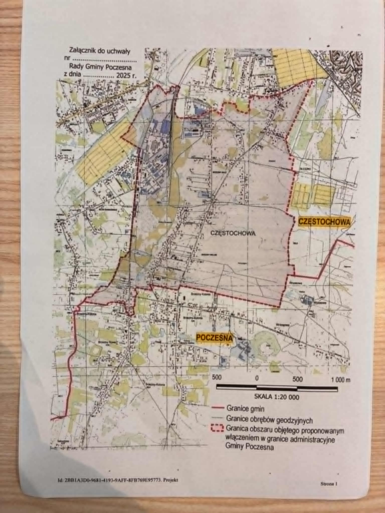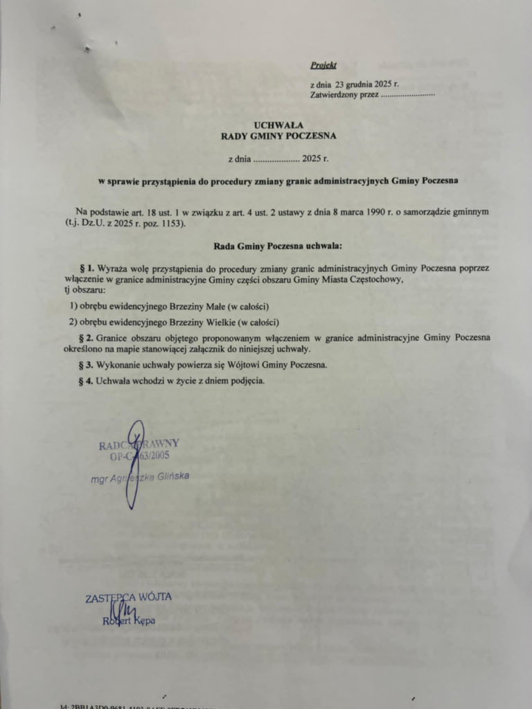 Mianowicie podczas dzisiejszej (23.12.2025) zwyczajnej sesji Rady Gminy Poczesna na ostatni moment, bo jeszcze dzisiaj rano, wprowadzono do porządku obrad uchwałę dotyczącą woli przyłączenia do gminy Poczesna Brzezin Małych oraz Brzezin Wielkich. Tereny te kiedyś były oddzielnymi miejscowościami, będącymi częścią gminy Poczesna, jednak w 1977 roku zostały włączone w granice Częstochowy. Teraz radni gminy Poczesna niejako chcą zagrać na nosie władzom Częstochowy i na postawienie ich przed faktem dokonanym podejmując uchwałę o pochłonięciu kolejnej części gminy odpowiadają uchwałą o przywróceniu gminie jej dawnych miejscowości. Uchwała została podjęta także mamy do czynienia z naprawdę interesującą sytuacją. Poniżej publikujemy treść uchwały wraz z uzasadnieniem.