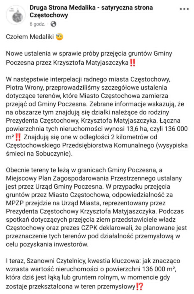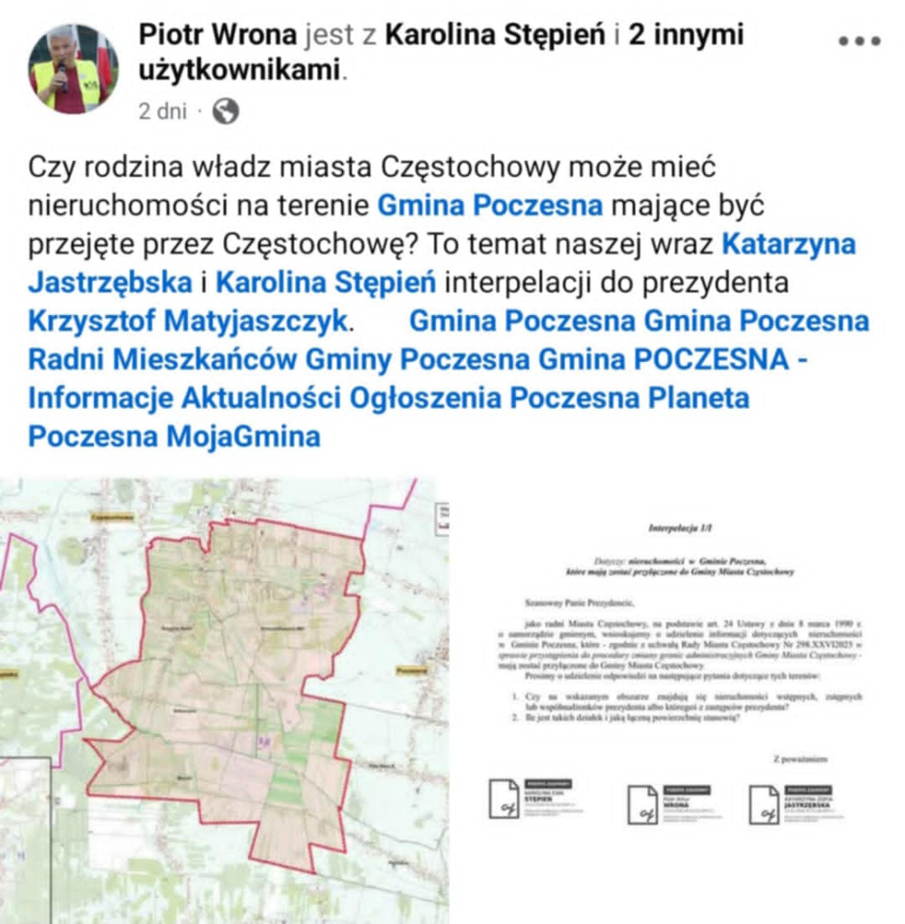 Częstochowscy radni Prawa i Sprawiedliwości Piotr Wrona, Katarzyna Jastrzębska oraz Karolina Stępień złożyli interpelacje w celu udzielenia informacji w sprawie działek należących do rodziny prezydenta Krzysztofa Matyjaszczyka, jakie mają się znajdować na anektowanym terenie gminy Poczesna.