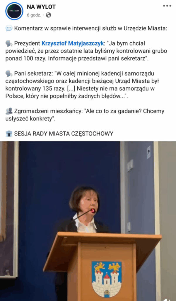 Informacja miała się tyczyć raportu z interwencji organów ścigania. Tymczasem z ust pani sekretarz mogliśmy usłyszeć o interwencjach np. Straży Pożarnej. Fakt, że budynek Urzędu Miasta posiada odpowiednią liczbę wyjść ewakuacyjnych jest godny docenienia, jednakże nie o to chodziło w tym punkcie. O samych interwencjach, o wziętych pod lupę dokumentach, czy też resortach nie dowiedzieliśmy się nic. „Miasto Częstochowa współpracuje z organami ścigania i nie chcę, aby jakieś nieodpowiedzialne postępowania nam tę współpracę zaburzyły” – mówił prezydent.