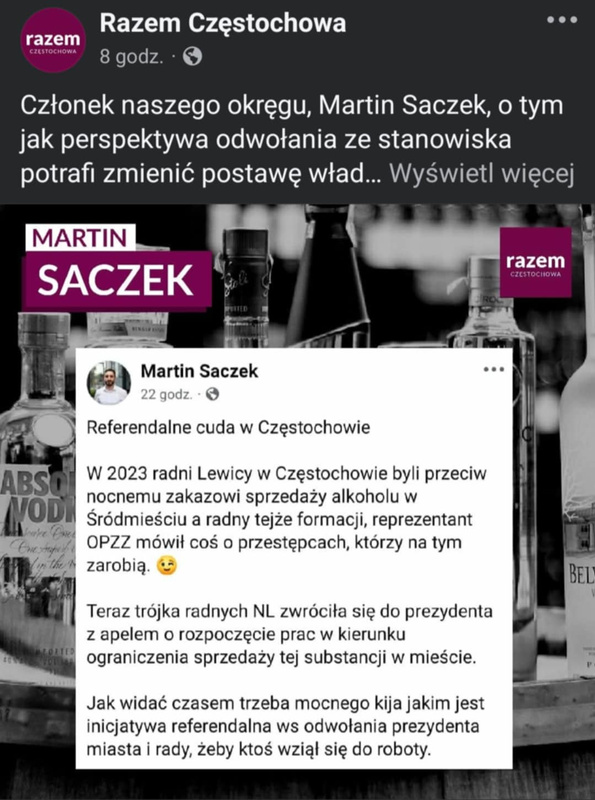 Cała sytuacja nie umknęła częstochowskim działaczom partii RAZEM Adriana Zandberga. Biernie się temu nie przyglądali i również postanowili zostawić swój komentarz. We wpisie Martina Saczka cytowanego przez profil „Razem Częstochowa” czytamy: „Referendalne cuda w Częstochowie. W 2023 radni Lewicy w Częstochowie byli przeciw nocnemu zakazowi sprzedaży alkoholu w Śródmieściu, a radny tejże formacji – reprezentant OPZZ mówił coś o przestępcach, którzy na tym zarobią. Teraz trójka radnych NL zwróciła się do prezydenta z apelem o rozpoczęcie prac w kierunku ograniczenia sprzedaży tej substancji w mieście. Jak widać czasem trzeba mocnego kija, jakim jest inicjatywa referendalna ws. odwołania prezydenta miasta i rady, żeby ktoś się wziął do roboty”.
