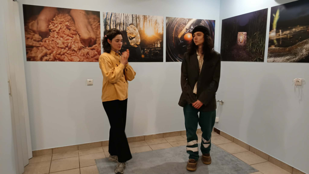 Już pierwszy rzut oka na fotografie uświadamiał, że to nie jest zwykła wystawa. Na jednej ze ścian wisiała twarz — wygięta w nienaturalnym kącie, jakby kamera złapała moment tuż przed zapadnięciem w sen, kiedy ziemia pod stopami zaczyna być bardziej umowna niż faktyczna. Obok, w innej pracy, stopy w otoczeniu czegoś, co przypominało wirujące, mięsiste trociny, jakby świat pękł na chwilę i pokazał swoje unerwione wnętrze. A kilka kroków dalej — odcięte świńskie (?) kopyta (?) sfotografowane w tak dramatycznym skrócie perspektywicznym, że aż chciało się zapytać, czy artysta nie wpadł przypadkiem do jakiejś metafizycznej beczki po śledziach.