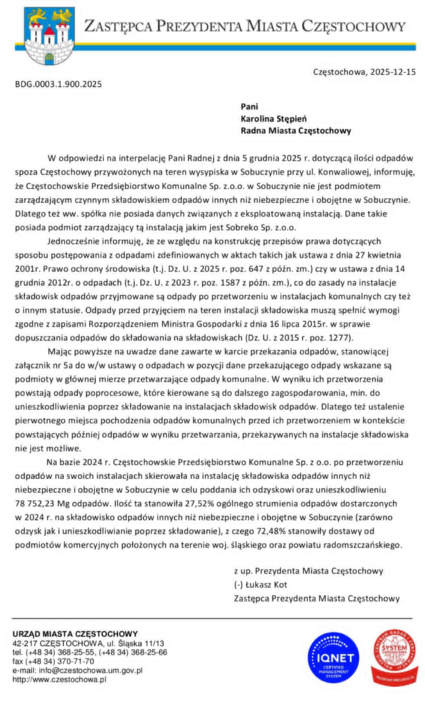 To właśnie na tą interpelację dotyczącą pochodzenia odpadów lądujących na Sobuczynie pojawiła się odpowiedź sformułowana przez wiceprezydenta miasta Łukasza Kota z upoważnienia prezydenta Matyjaszczyka. Poniżej publikujemy jej treść.