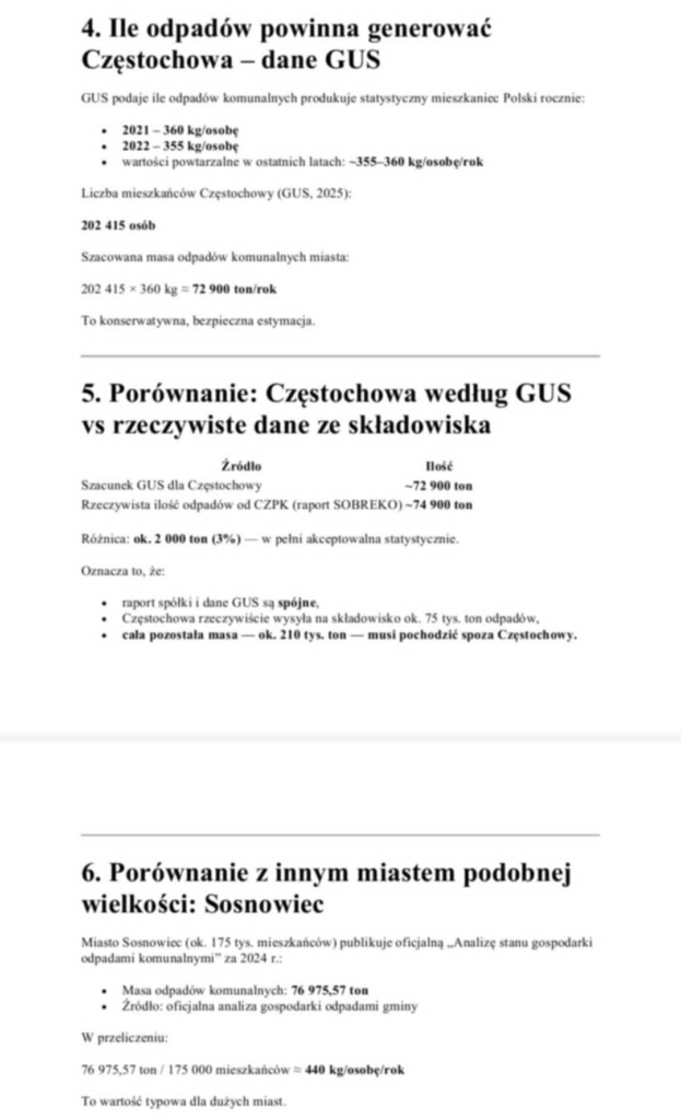 Przed tygodniem sami dotarliśmy do sprawozdania z działalności spółki Sobreko za rok 2024, która to obecnie będąc w posiadaniu drugiej kwatery wysypiska odpowiada za przyjmowanie 100% odpadów trafiających na SPSZOK (pierwsza kwatera jest już wygaszona) i z tego tytułu pochodzi 100% przychodów spółki. Więcej o tym przeczytasz w tym miejscu (LINK). O tym również wspomina w odpowiedzi wiceprezydent informując o 27% przychodów spółki pochodzących od CzPK, które bezpośrednio odpowiada za odpady częstochowskie. W istocie stanowi to okolice 78 000 ton odpadów. Skoro stanowi to jednak zaledwie 27% całości odpadów przyjętych w 2024 roku oznacza to, że na składowisko w roku poprzednim trafiło ich łącznie ponad 286 000 ton. I tutaj zaczynają się wątpliwości, ponieważ nie jest możliwe, aby mieszkańcy Częstochowy wygenerowali tyle odpadów w ciągu roku. Świadczą o tym dane GUS, które umieszczamy poniżej oraz zwykła logika, bo czy jest możliwe, aby przeciętny częstochowianin generował grubo ponad tonę odpadów komunalnych rocznie?