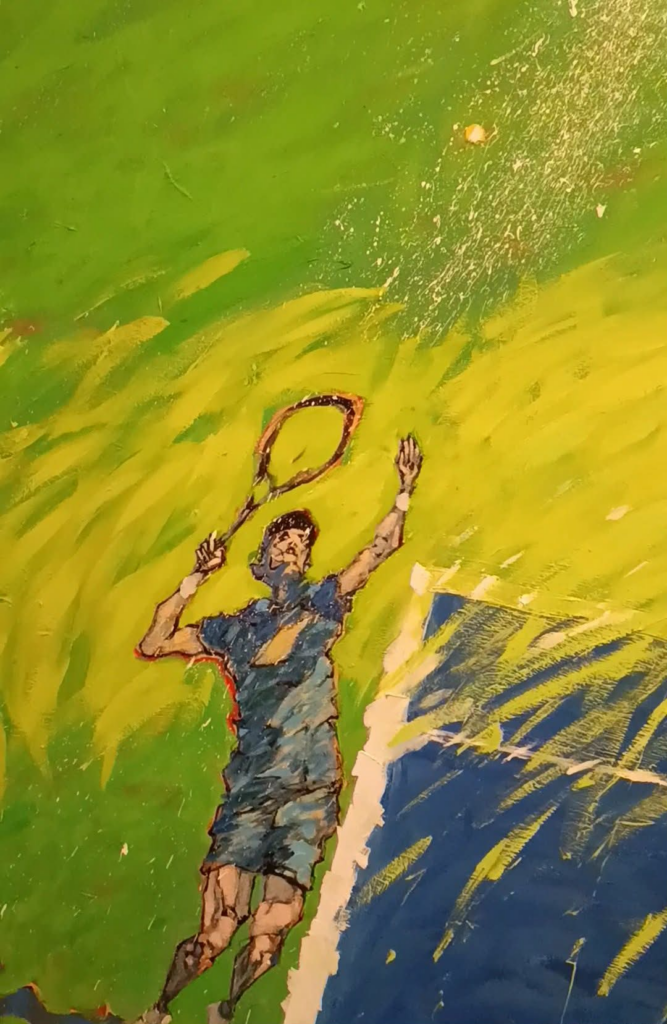 Motywy kulinarne, dekoracyjne, azulejos i ta charakterystyczna śródziemnomorska aura sprawiały, że z każdym krokiem rosło wrażenie zanurzenia w świecie smaków i światła. Publiczność przystawała przy obrazach i niemal jednogłośnie słychać było: „Chciałbym tam być…”. Niektórzy dodawali nawet cicho: „I coś zjeść…”. Sonia, ze swoją malarską dojrzałością (i imponującym dorobkiem wystaw od Częstochowy po Rumunię), ponownie udowodniła, że potrafi opowiadać historie małych przyjemności z taką lekkością, że człowiek od razu zaczyna planować wakacje. Potem nastąpiło dynamiczne przejście — niczym zmiana kanału z „Kuchennych rewolucji” na finał Wimbledon. Obrazy Tomasza Wojtyska to eksplozja ruchu i napięcia. Tenisiści łapiący wymarzony forhend, piłkarze zawieszeni w powietrzu na chwilę przed strzałem, rowerzyści pędzący tak, że aż widz musiał instynktownie zrobić krok w bok.