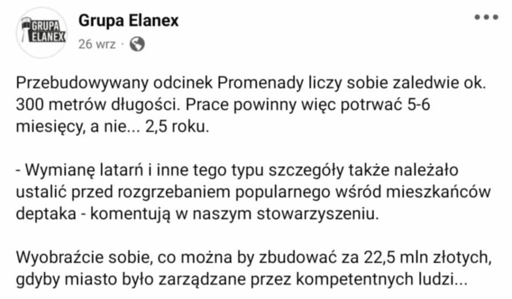 Zatem choć finalizacja całości projektu łącznie z węzłem komunikacyjnym jest planowana na jesień 2027 to jednak takie opóźnienia już na samym początku wskazują, że prawdopodobnie na całość poczekamy o wiele dłużej. Grupa Elanex regularnie wytykająca niekompetencję władz miasta, tym razem wskazuje na brak zadbania o podstawy konieczne do realizacji projektu.