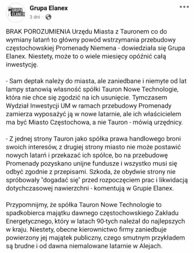 Jak jednak wynika z informacji przekazanych na portalu Facebook przez Grupę Elanex, głównym problemem jest oświetlenie Promenady, które należy do Tauronu i do tej pory nie ma porozumienia między firmą, a miastem co do wymiany oświetlenia.