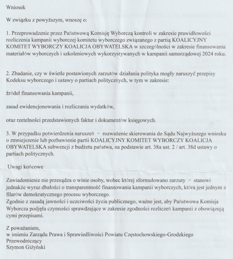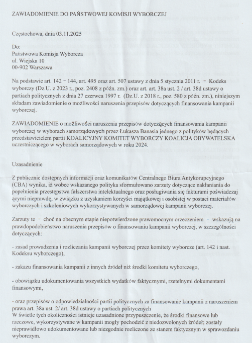 W związku z jednym z zarzutów dla Łukasza B. poseł z Częstochowy Szymon Giżyński złożył zawiadomienie do Państwowej Komisji Wyborczej.