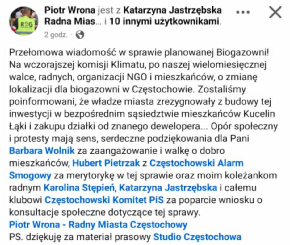 Wpis umieścił na swoim profilu w mediach społecznościowych radny Piotr Wrona. Z przedstawicielem PiS udało nam się również porozmawiać podczas sesji rady miasta, na której poznaliśmy więcej szczegółów.