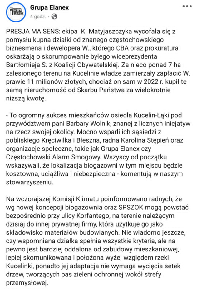 Temat budowy biogazowni i PSZOKu to gorąca w ostatnich miesiącach sprawa w Częstochowie. W marcu tego roku na nadzwyczajnej sesji rady miasta przegłosowano budowę tych punktów, mimo sprzeciwu radnych PiSu. Lokalizacją budowy pierwotnie miał być zalesiony teren na końcu ulicy Kucelin-Łąki blisko zabudowań mieszkalnych. Ostatnie miesiące były obwite w regularne protesty mieszkańców okolicy, których wspierali radni Prawa i Sprawiedliwości, czy także Grupa Elanex.